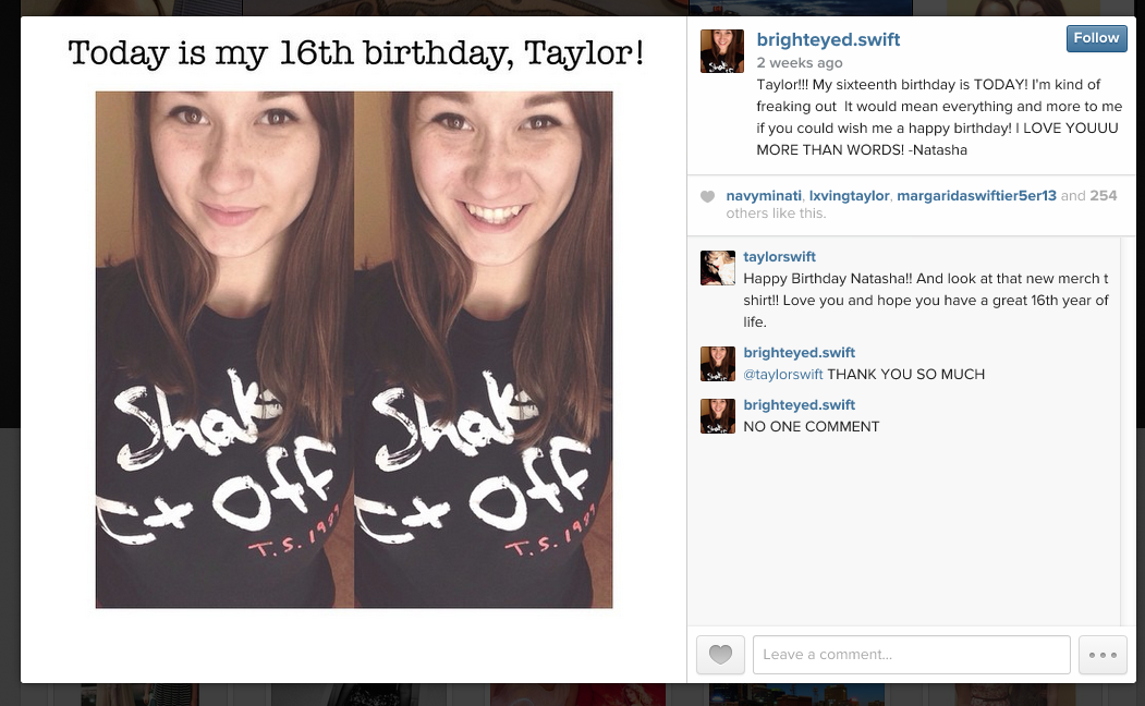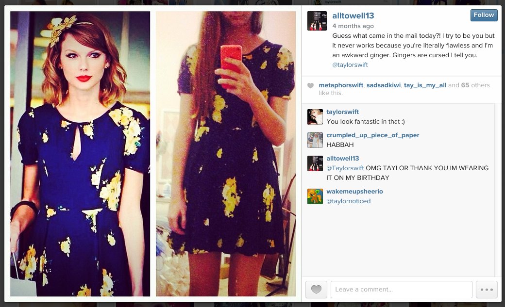 Míg másoknak asszisztenseik kezelik a profiljukat, addig Taylor saját kezében tartja a szálakat. Így tényleg cenzúrázatlanul azt látjuk, őt mi érdekli, ő milyen. Nem vagyunk naivak, persze, hogy Ms Swift meggondolja mit tesz ki, de választásai hibátlanok.